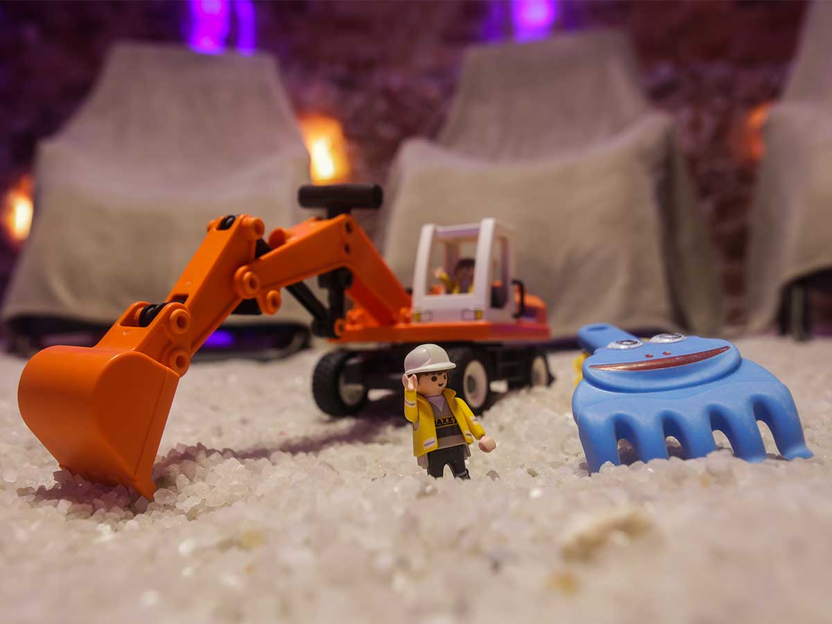 Eure Kinder dürfen mit Baggern und Sandelzeugs im Salzgranulat spielen – wie in einem großen Sandkasten. Die Kleinen dürfen gerne auch eigenes Spielzeug mitbringen und nach Herzenslust buddeln. So ganz nebenbei atmen Sie dann das gesunde Mikroklima ein.